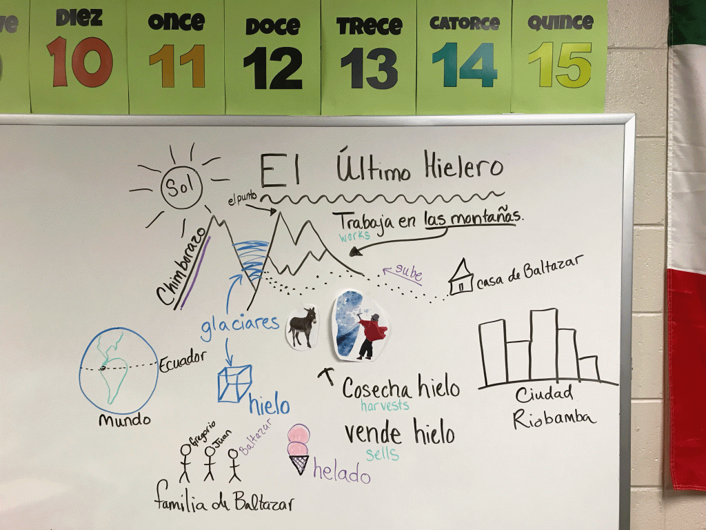 Have a white board? Or a document camera? Using the leveled story of el último hielero (see lesson plans above) as your foundation, draw the true story out for your students. I like to have multiple colors of pens or markers to draw students’s attention. Depending on the group or how many cups of coffee I had, I sometimes have English on the board to assist comprehension and sometimes I am able to keep the entire story in Spanish. The first time I drew the story, my drawings were pretty terrible – embrace the bad drawings! Make fun of yourself a little a move on – the bad drawings will help maintain focus for students. I will be teaching this unit again this semester and hope to get a video up here to demonstrate how I tell this story.