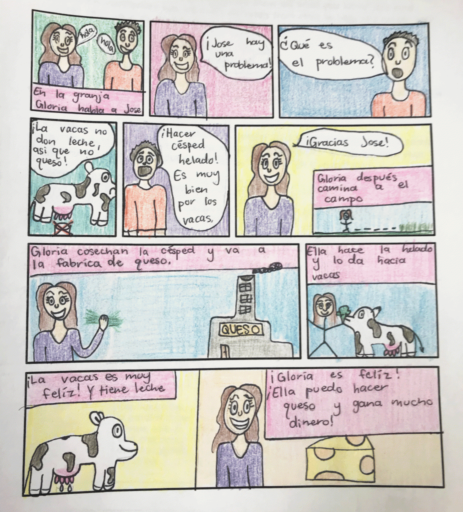 After showing the documentary, students continue to work with the language needed to understand and retell the story of Baltazar through the unit. In my Spanish 1 classroom, this is students first time targeting third person conjugations with an array of verbs. There are many high frequency words that come into play and we complete activities to promote acquisition of these terms. By the end of the unit, students are able to recount the story of Baltazar using language within their proficiency level and get creative to tell a new original story of their own. At this proficiency level there are anticipated errors as students grow to acquire structures such as vive, hay, hace, cosecha, gana, and tiene. Check out all this language acquisition from a Spanish 1 student!