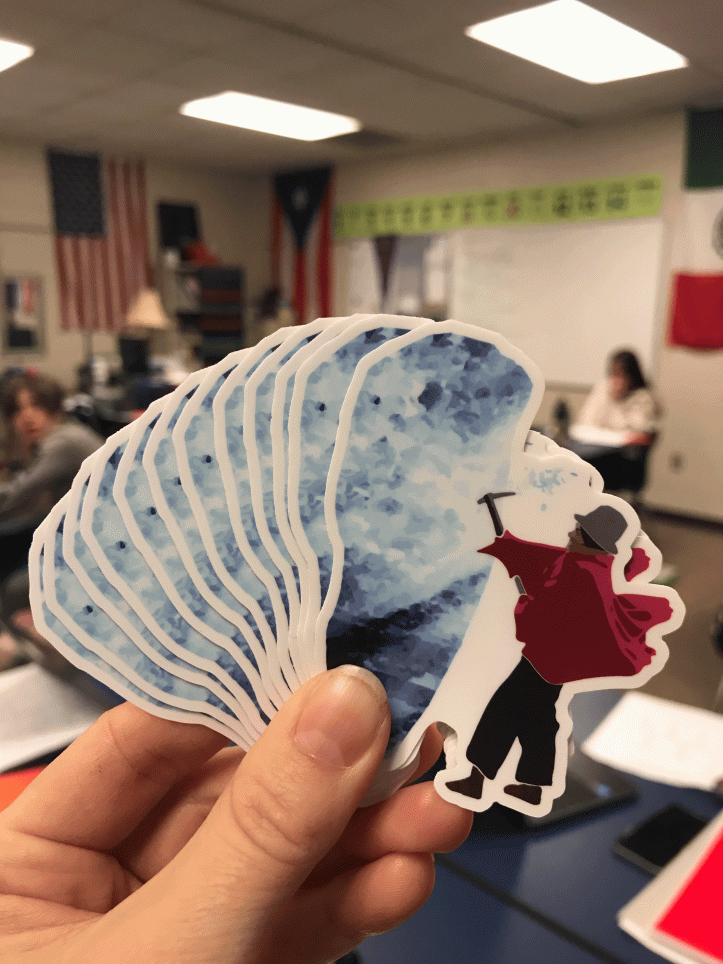 A sticker of Baltazar Ushca harvesting glacial ice from Mount Chimborazo.