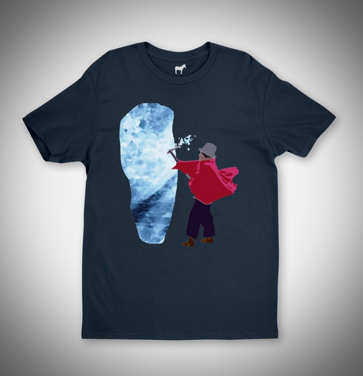 A tagless, soft t-shirt with an image of Baltazar Ushca harvesting glacial ice from Mount Chimborazo.
